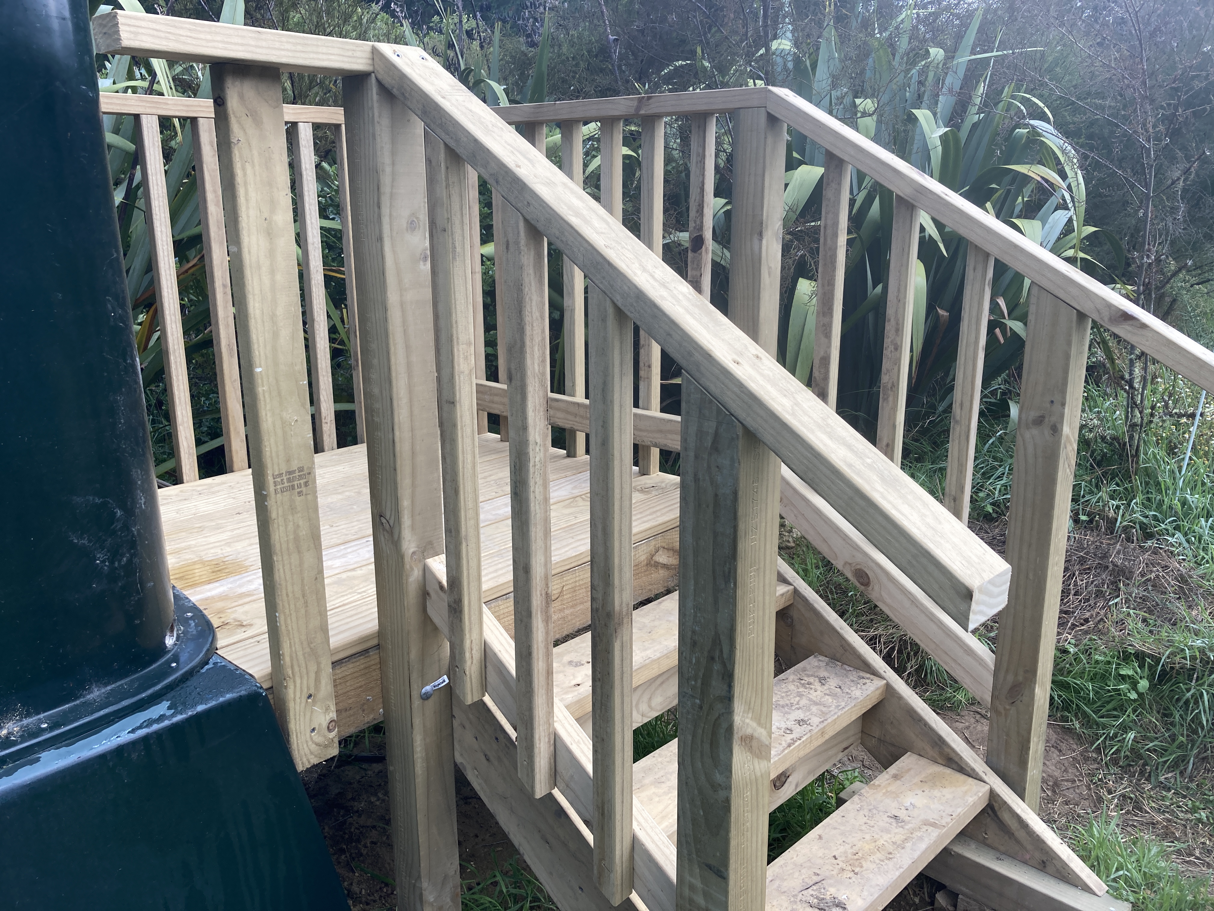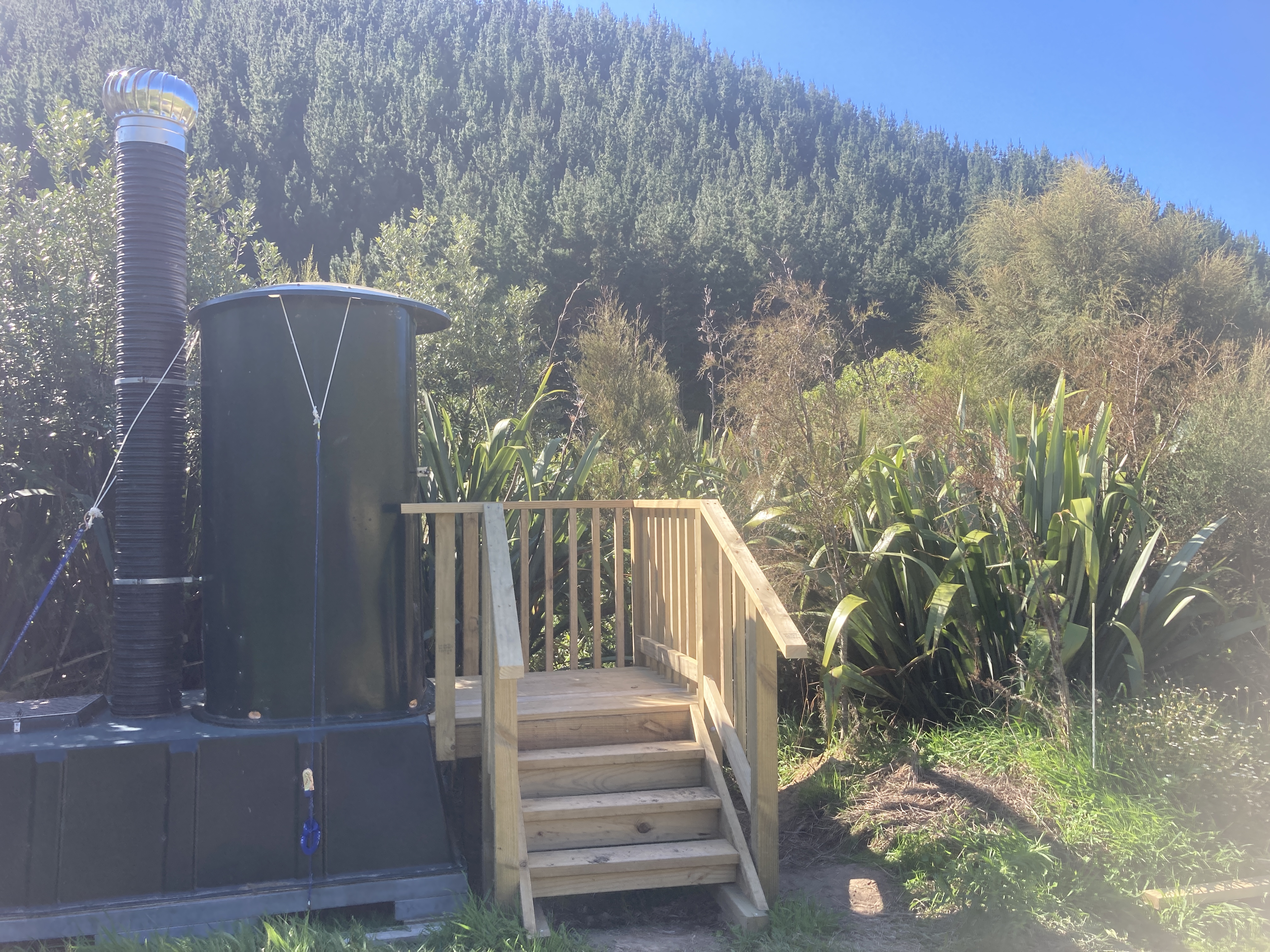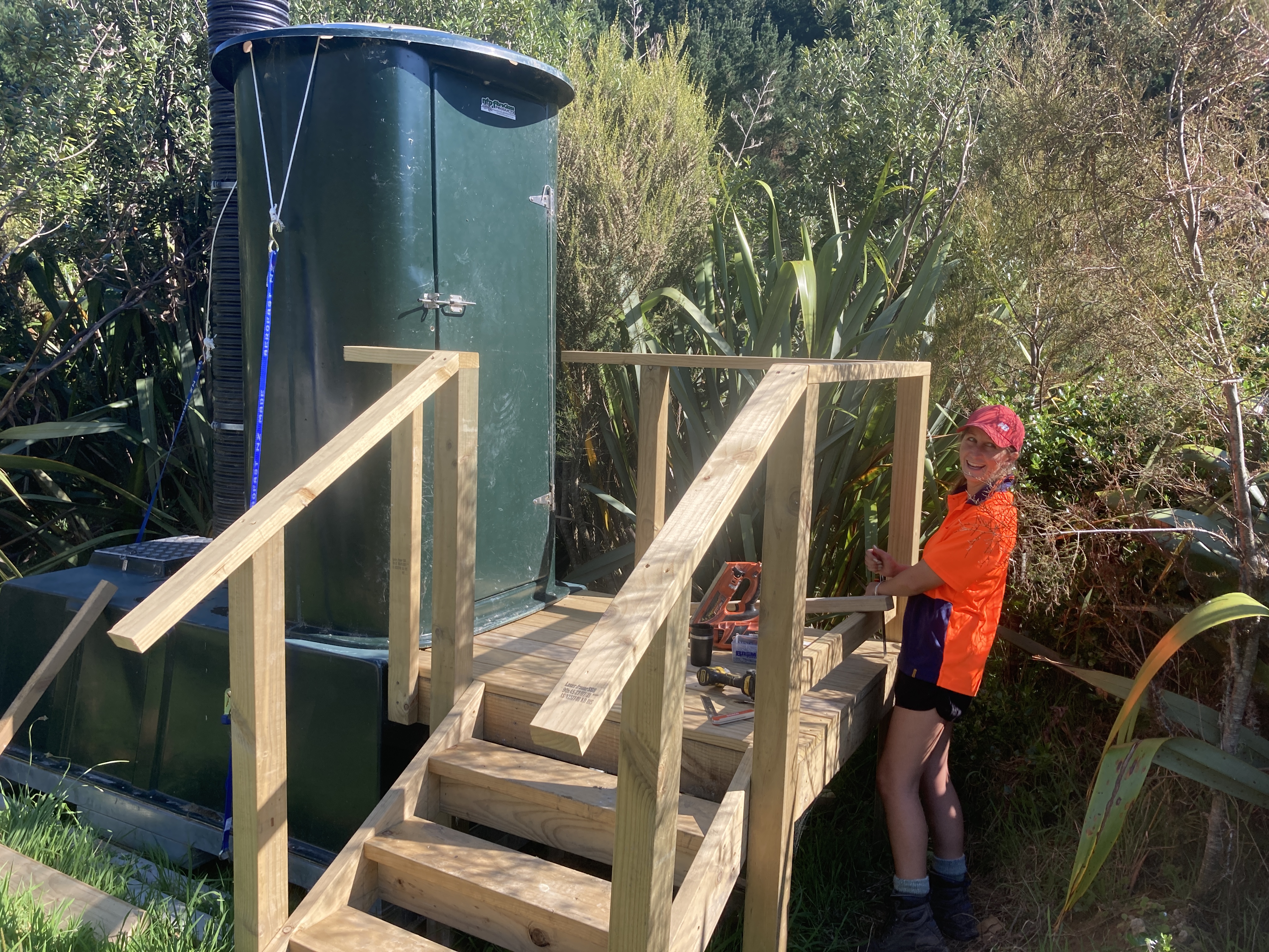 The Whangawehi team is working hard at preparing the final touches along the walkway. The toilet facilities near the hut are now accessible via a wooden staircase. The hut has now a bench and a tank (not fitted yet). Hannah Coop, new owner of Taharoa has now blocked off the gaps that were used by birds to nest in the hut. With a fresh sweep, the hut is looking great.